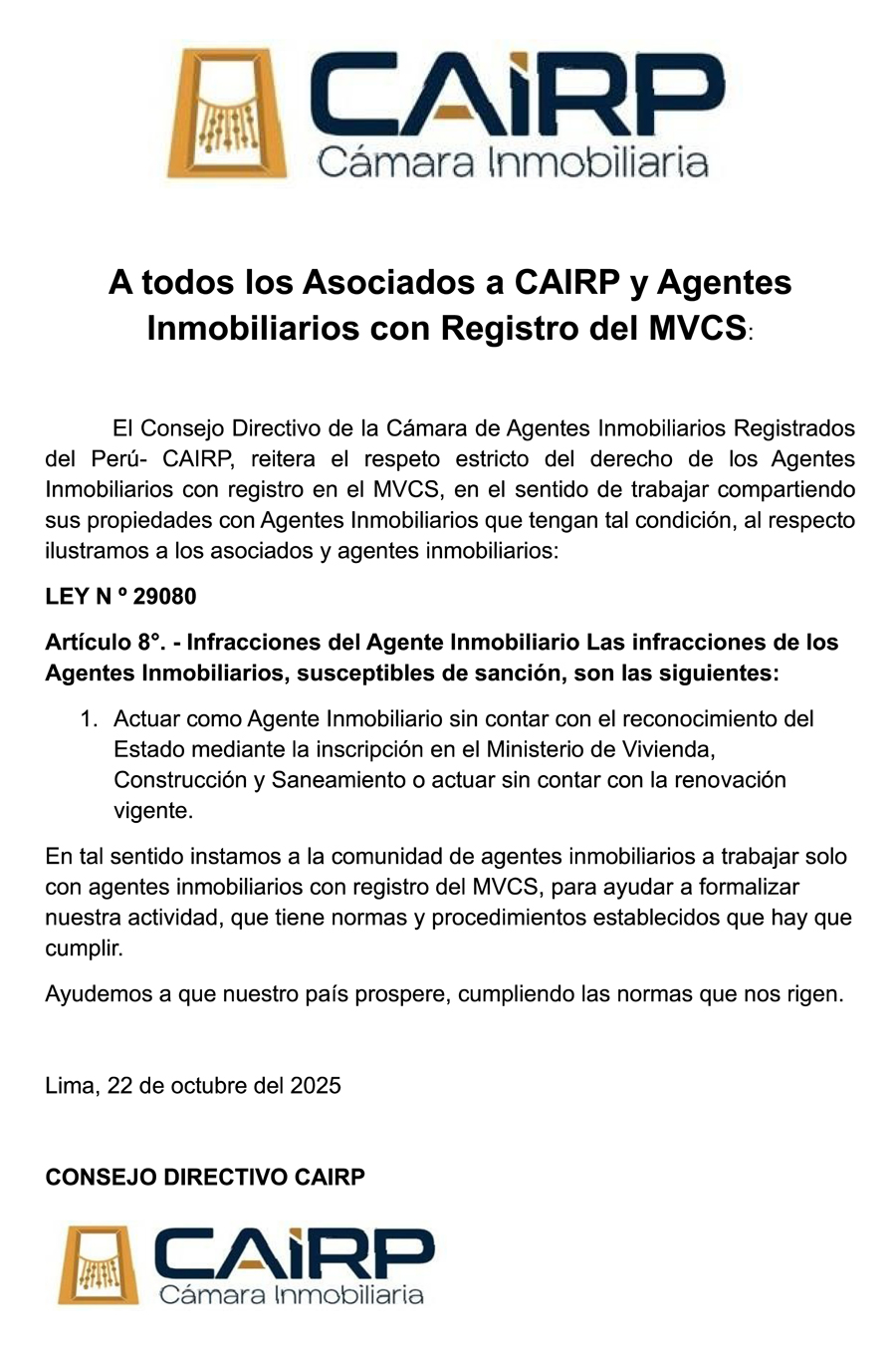 La Cámara de Agentes Inmobiliarios Registrados del Perú (CAIRP) tiene como misión formar agentes inmobiliarios con sólida capacitación y valores éticos, promoviendo una gestión exitosa dentro de los principios de integridad.